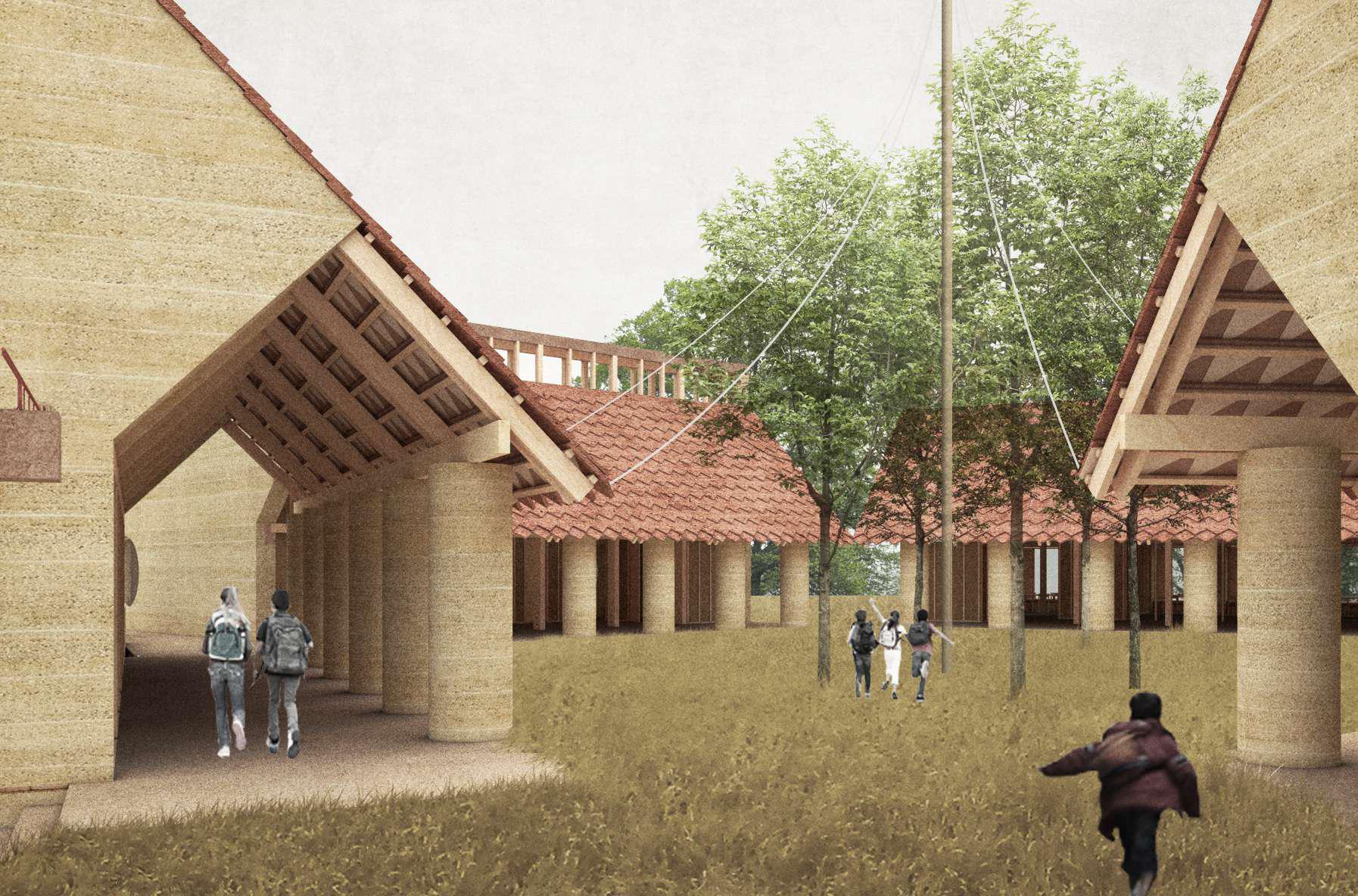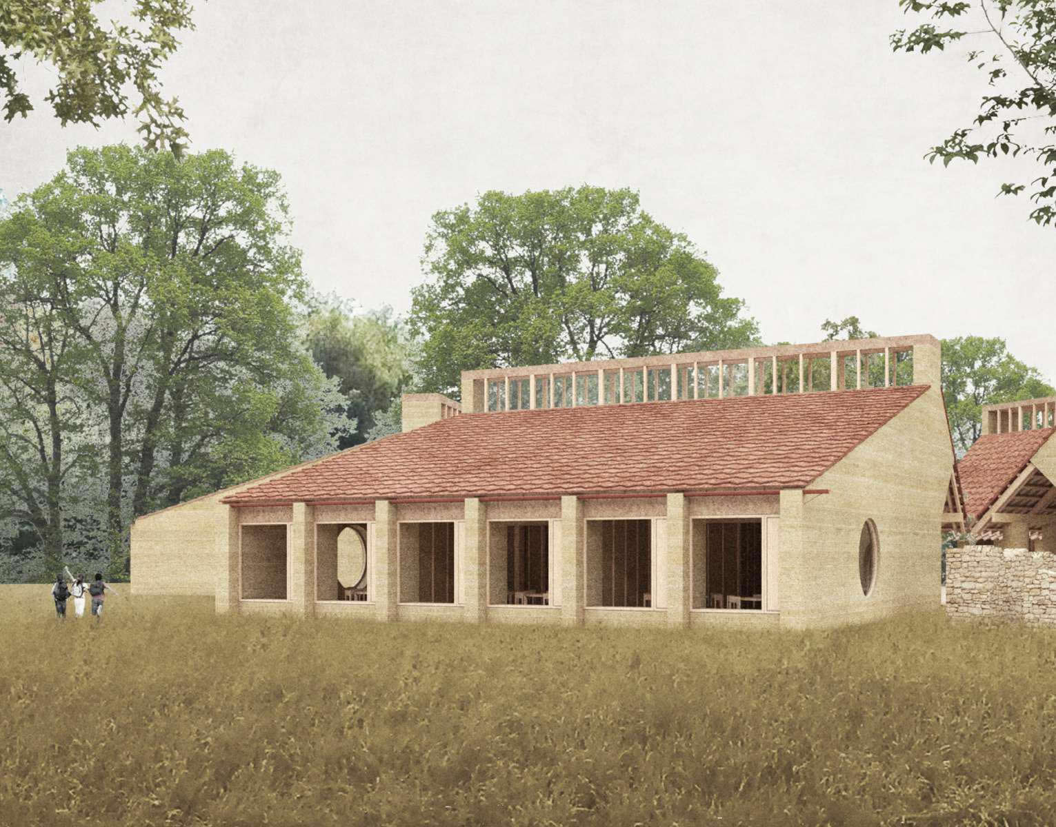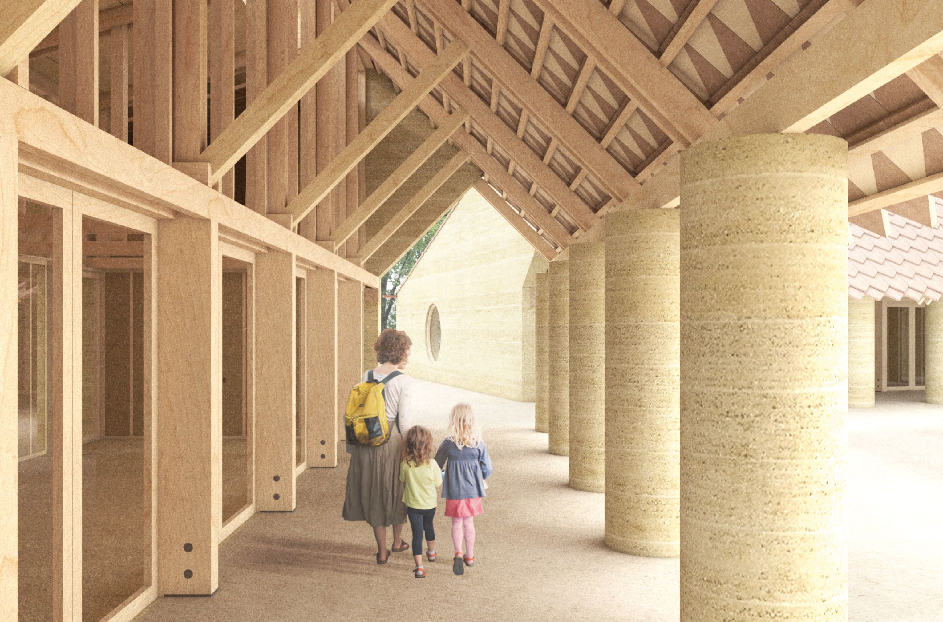 El projecte arquitectònic, dissenyat per TEdA Arquitectes amb l’experiència de Marboris Ville et Paysage, utilitza tècniques de bioconstrucció com els murs de terra compactada (tàpia), fusta de proximitat, ceràmica local i suro, configurant un edifici amb confort tèrmic i un fort respecte pel medi ambient. Aquest treball facilita una immersió profunda dels infants en un entorn saludable i natural, potenciant el seu benestar i aprenentatge.