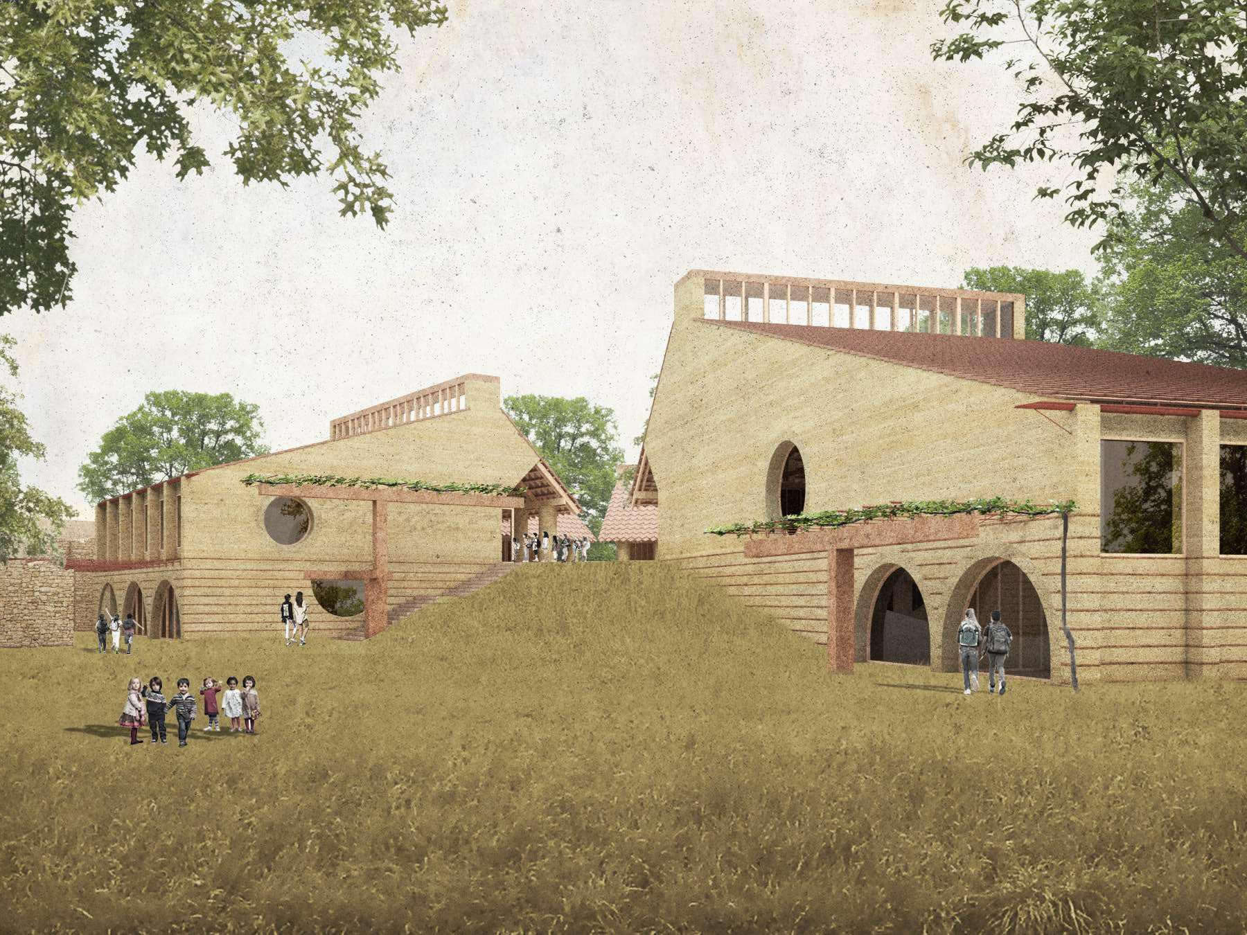 Les espaces extérieurs sont organisés par âges et fonctions : cours différenciées, zones de jeux naturalisées avec des éléments en bois et de la végétation, jardins scolaires, forêts comestibles, clairières pour l'étude et l'observation, et zones de psychomotricité intégrées aux talus. Des parcours accessibles garantissent une inclusion universelle et relient tous les espaces de manière fluide.