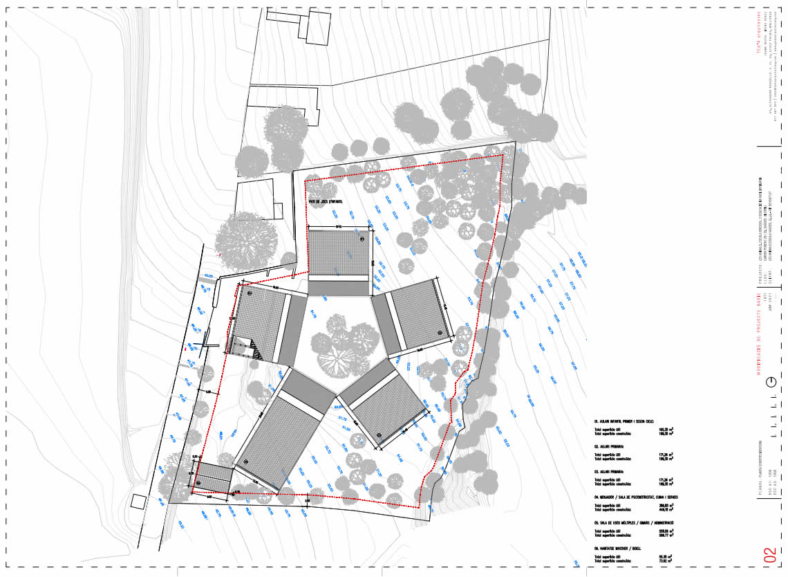 Le bâtiment s'adapte à la topographie existante en créant une continuité entre l'intérieur et l'extérieur, avec des espaces lumineux, sains et thermiquement efficaces. Les murs en terre compactée offrent un confort thermique et acoustique, tandis que les revêtements permeéables favorisent l'infiltration naturelle de l'eau.
